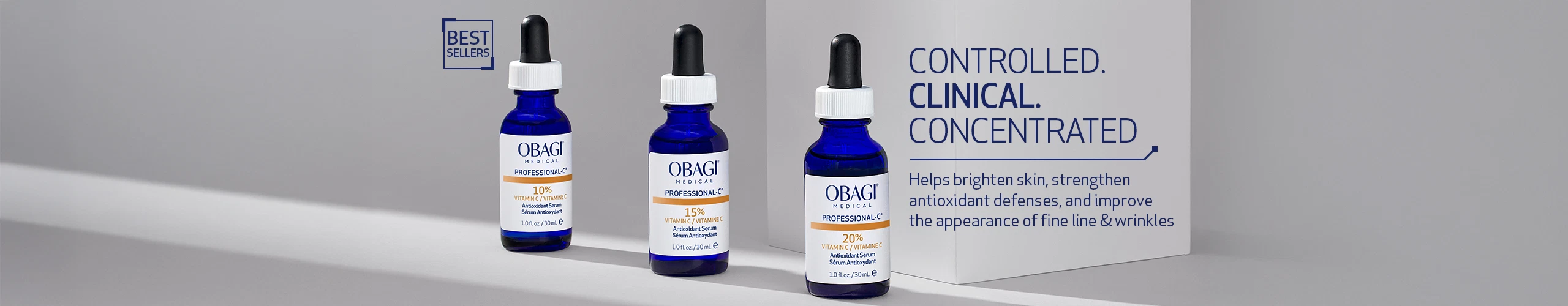 Experience the benefits of medical-grade Vitamin C with Obagi’s Professional-C Collection. As one of the most potent antioxidants in skincare, Vitamin C can help skin look brighter, reduce the appearance of fine lines, and support collagen production. Our dermatologist-approved serums are designed to help enhance skin radiance while working to provide protection against environmental stressors.
